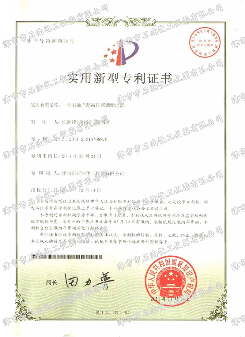 實用新型專利證書-一種石油產(chǎn)品減壓蒸餾測定器